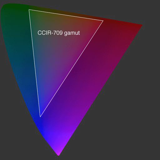 Figure 1 shows the perceptually uniform CIE (u´,v´) color diagram, with the positions of the CCIR-709 primaries. These primaries are a reasonable approximation to most CRT computer monitors, and officially define the boundaries of the standard sRGB color space. This triangular region therefore denotes the range of colors that may be represented by these primaries, i.e., the colors your eyes can be fooled into seeing. The colors outside this region, continuing to the borders of our diagram, cannot be represented on a typical monitor. More to the point, these “out-of-gamut” colors cannot be stored in a standard sRGB image file nor can they be printed or displayed using conventional output devices, so we are forced to show stand-in colors in this figure.
