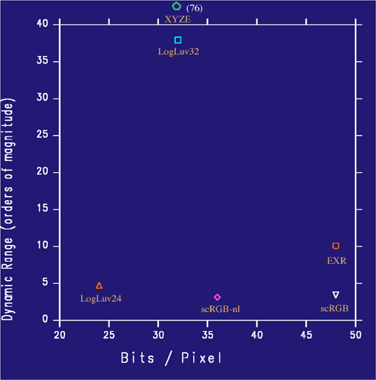 As we can see from Table 1, RGBE and XYZE are the winners in terms of having the most dynamic range in the fewest bits, and the XYZE encoding even covers the visible gamut. However, 76 orders of magnitude is so far beyond the useful range, that we have chosen to show XYZE as an outlier on our plog (Figure 5).