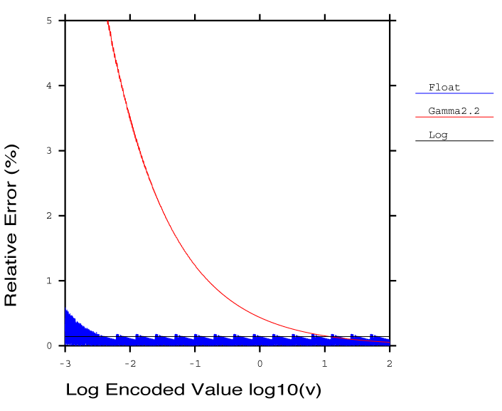 There are actually three variants of this logarithmic encoding. The first pairs a 10-bit log luminance value together with a 14-bit CIE (u´,v´) lookup to squeeze everything into a standard-length 24-bit pixel. This was mainly done to prove a point, which is that following a perceptual model allows you to make much better use of the same number of bits. In this case, we were able to extend to the full visible gamut and 4.8 orders of magnitude of luminance in just imperceptible steps. The second variation uses 16 bits for a pure luminance encoding, allowing negative values and covering a dynamic range of 38 orders of magnitude in 0.3% steps, which are comfortably below the perceptible level. The third variation uses the same 16 bits for signed luminance, then adds 8 bits each for CIE u´ and v´ coordinates to encompass all the visible colors in 32 bits/pixel.