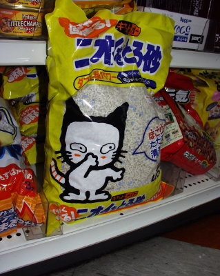 While Jeff purchased an umberella at a local AM/PM Minimart, I checked out the products on the shelves. I thought this bag of hello kitty litter was a riot.