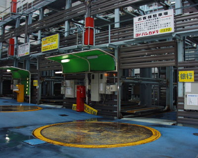 One of the many novel aspects of the city is the use of space, which is always at a premium. Here we see a typical "garage," where cars are literally stacked one atop another using a mechanical elevator and placement system. The second image shows one of the turntables used to turn cars around without providing the space normally required to do so.