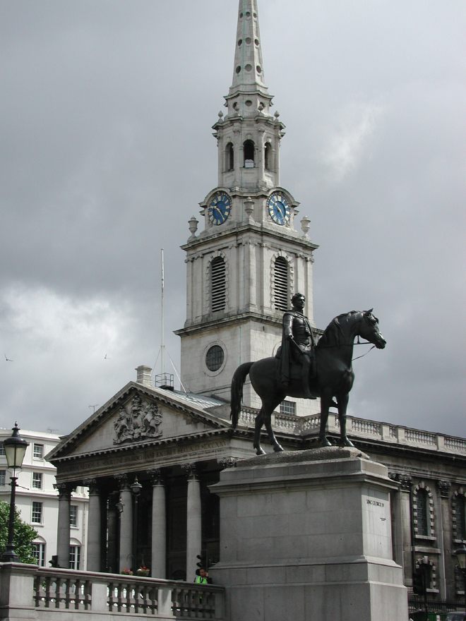 A view of the familiar Trafalgar Monument from behind. (I think.)